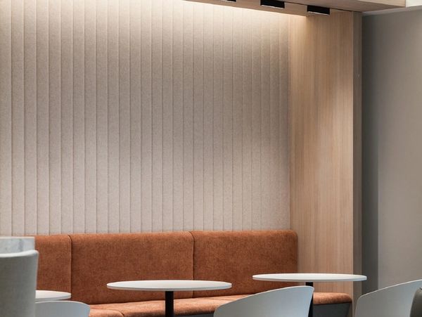 Two color sound-absorbing board, using 9+9 mm double layer polyester fiber sound-absorbing board, 12 mm polyester fiber Plate + 3 mm felt, to achieve different background and surface color, multi-level visual effect.